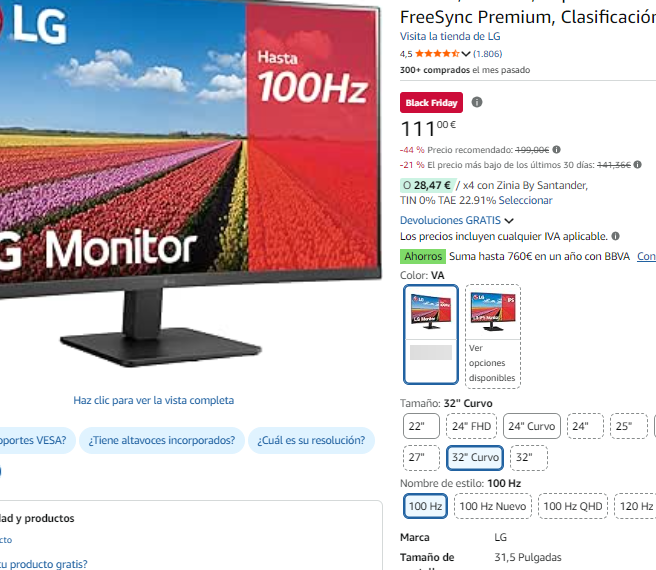Monitor LG 32" curvo 100Hz FULLHD - 178º / 178º ►111€ con envío