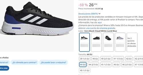 Disponibles a 26.49€ en Amazon desde el número 42 al 44.6 (captura). Más barato que en Sprinter a 43.06€ y por menos que Cloudfoam sin cordones a 34.99€.