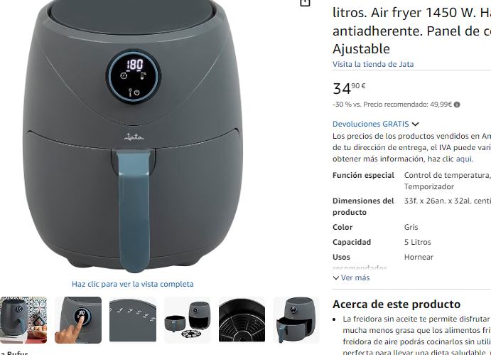 Freidora sin aceite Jata 5L táctil - cocción por aire caliente ►34.9€ en Amazon