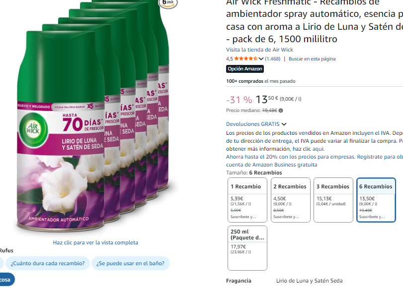 Ha bajado de precio a 13.5€ (2.2€ /ud) en Amazon al pedirlo en compra recurrente (captura) Más barato que en otras tiendas, por ejemplo en SoySuper (Eroski) a 5€/ud. o en Carrefour a 4.3€/ud..