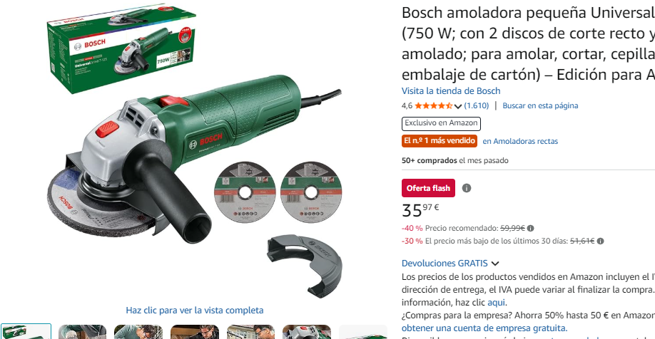 Disponible con 2 discos de corte + 1 disco de amolado a 35.97€K en Amazon (captura). Más barato que en otras tiendas, como por ejemplo en LeroyMerlin a 109.66€.