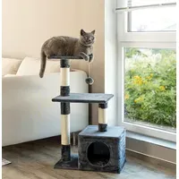 Su estructura ofrece 3 rascadores con cuerda arrollada de sisal sobre segmentos de 7.5cm de diámetro. Añadir que incluye una bola colgando del nivel más alto, su base mide 50cm x 30cm, la cueva 30cm x 30cm y la altura máxima del árbol es de 80cm.