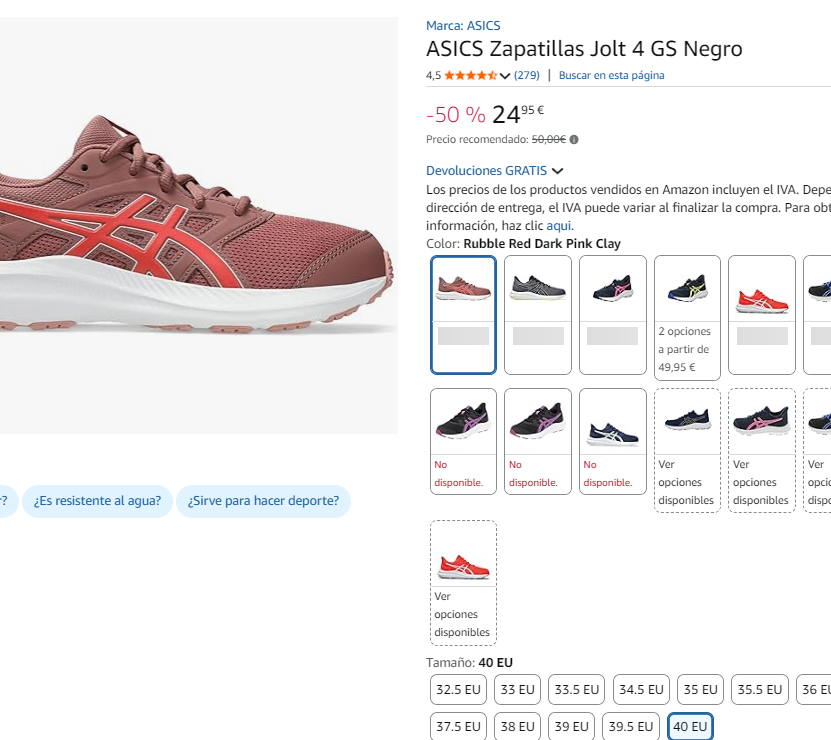 Disponibles a 24.95€ en Amazon en tallas entre 35 al 40 (captura). Más barato de lo que se encuentran en otras tiendas, como por ejemplo en Deporvillage a 45€ o en Sprinter 39.99€.
