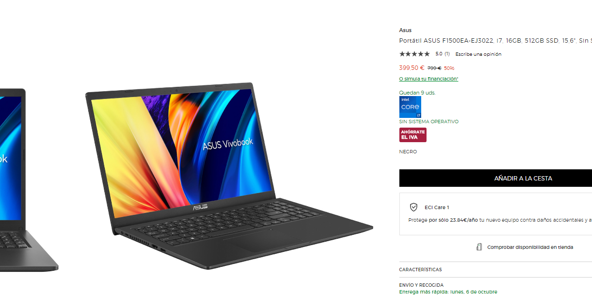 Disponible sin Windows instalado a 399.5€ en El Corte Inglés (captura). Más barato que uno de similar a 626.7€ reacon..