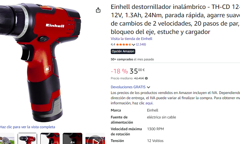 Taladro atornillador inalámbrico Einhell TH-CD 12-2 Li - par ajustable 24Nm ►35€