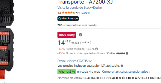 Black + Decker A7200-XJ es un maletín de 109 piezas que contiene 30 brocas, un portapuntas magnético para usar en atornilladores junto con 67 puntas para atornillar, 10 vasos hexagonales y 1 avellanador para hacer hendiduras principalmente en madera donde vayan tornillos que quieras que no sobresalgan sus cabezas.