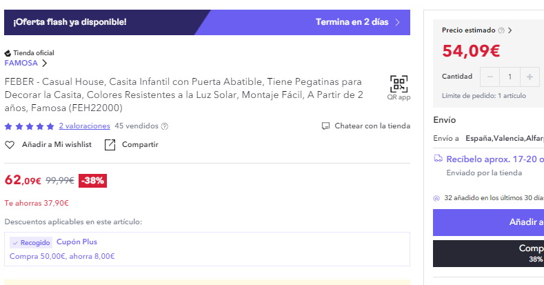 Disponible a 54.1€ en Miravia marcando cupón (¿cóm marcarlo?) (captura). Más barato que en otras tiendas, como por ejemplo en Amazon a 99.99€.