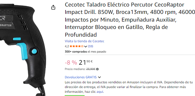 Taladro percutor 850W Cecotec CecoRaptor - 4800rpm - 46000IPM - 3M cable ►21.9€