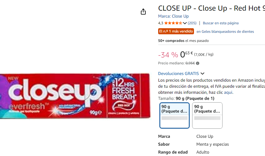 Disponible a 0.63€ en compra recurrente en Amazon (captura). A 0.94€ por 100ml, más barato que Colgate a 1.4€ / 100ml.