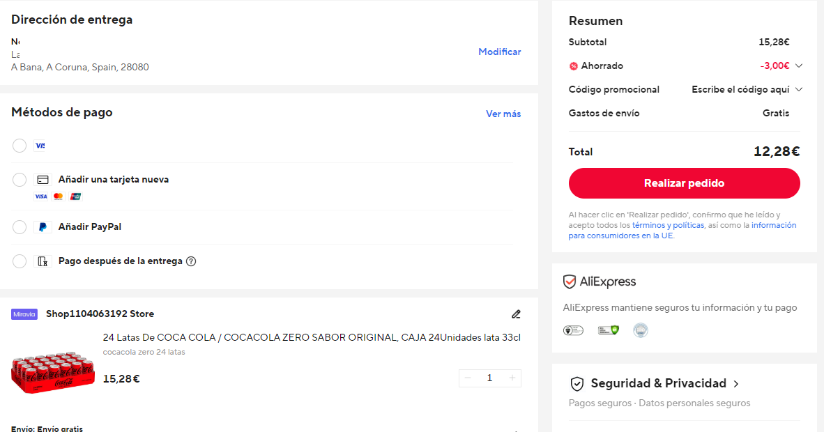 Disponible 24 latas a 12.28€ en Aliexpress aplicando código MES03 (captura). Más barato que en Amazon a 17.9€