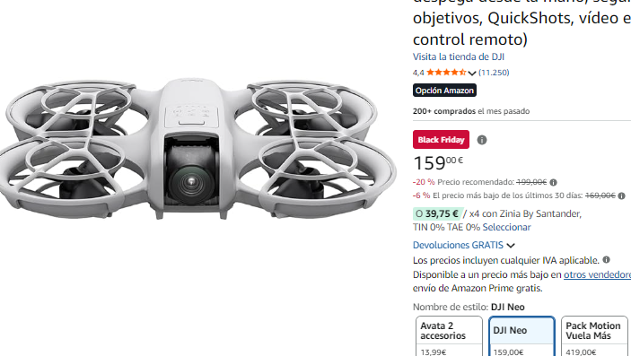 Drone DJI Neo - vídeo estabilizado 4K con seguimiento IA ►159€