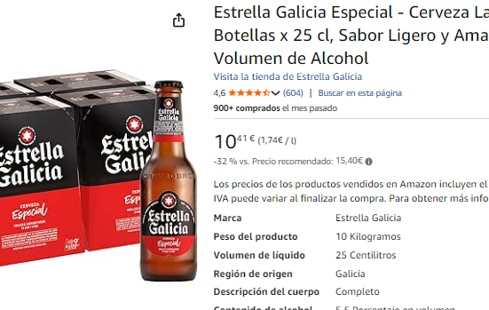Disponible a 10.41€ en Amazon (captura). A 1.73€ el litro, más barato que en formato latas a 2.45€ / L.