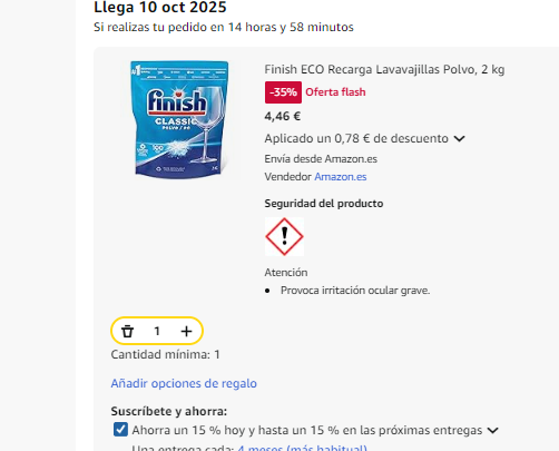 Disponible a 4.46€ marcando cupón compra recurrente en Amazon (captura)(¿cómo marcarlo?). Casi 0.05€ por dosis. más barato que alternativa Flota a 0.16€ / dosis.