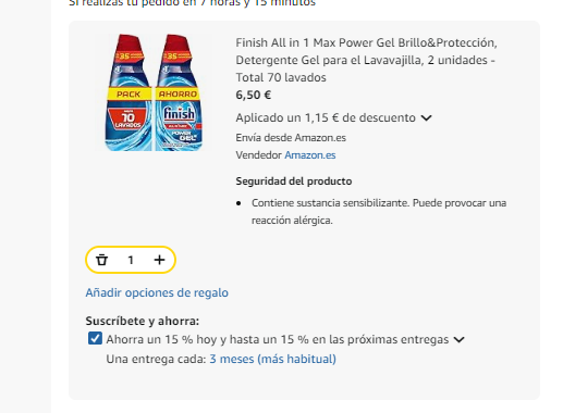 Finish Gel lavavajillas Todo en 1 Max Regular es un bote de gel concentrado para lavavajillas en oferta en pack de 2 botellas con 35 dosis cada una. Este producto es del mismo fabricante que Calgonit (fuente).