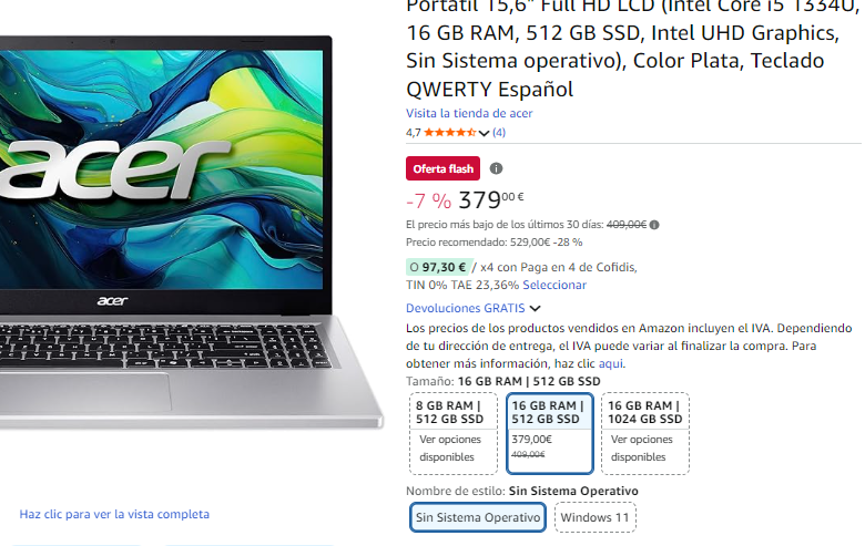 Disponible a 379€ en Amazon (captura). Más barato que similar en PC Componentes a 509€.