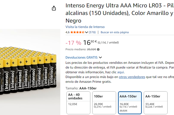 Disponible pack de 150x AAA a 16.8€ (0.11€ /ud.) en Amazon (captura) . Mucho más barato que lo que saldría algo similar AmazonBasics a 25.2€ .