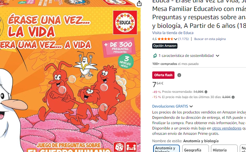 Educa Érase una Vez La Vida es un juego de mesa de preguntas sobre anatomía y biología basado en la serie clásica de televisión. Reúne más de 300 preguntas en 3 niveles, una cantidad que da margen para partidas variadas dentro de una caja pequeña.