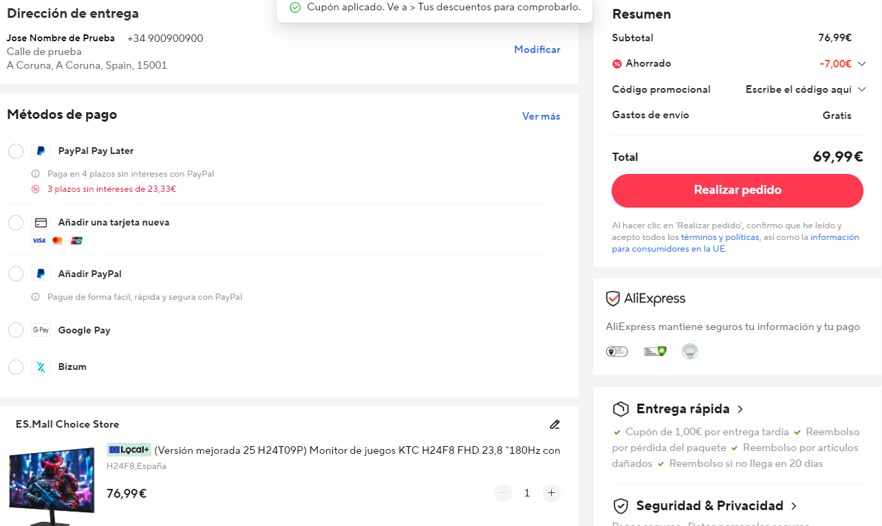 Disponible a 69.99€ en Aliexpress aplicando código FFES07 (captura). Más barato que PC Componentes a 89.99€.