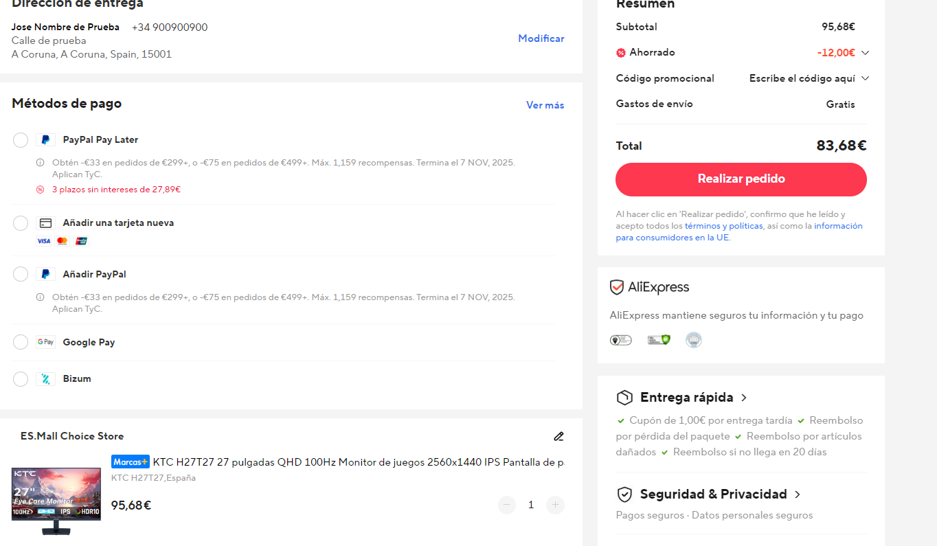 Disponible a 83.7€ en Aliexpress aplicando código ESCD12 (captura). Más barato que similar a 119.99€ aplicando cupón.