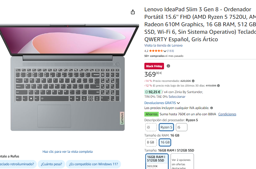 Lenovo Slim 3 16GB RAM - 15.6" FHD - Ryzen 5 7520U - 512GB SSD ►369€