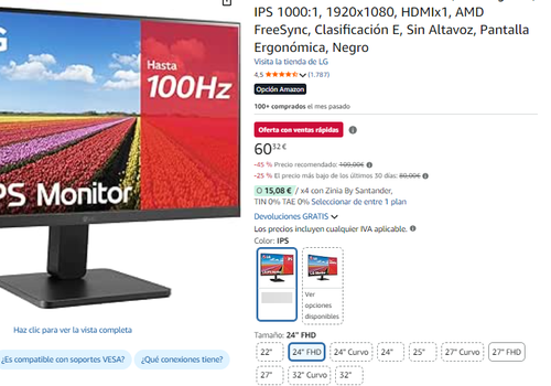 Disponible con panel de 24" a 60.3€ en Amazon (captura). Más barato de lo que llega a costar en otras tiendas, como por ejemplo en Miravia a 119.1€.