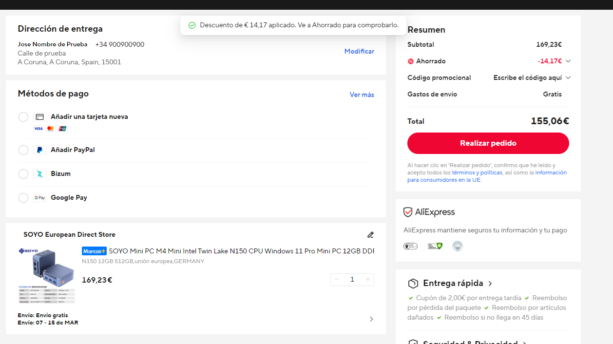 Disponible con 512GB SSD / 12GB RAM a 155.1€ en Aliexpress aplicando código IFP8TSEG o CDES13 (captura). Más barato que alternativa con peor CPU a 199.99€ en Amazon.