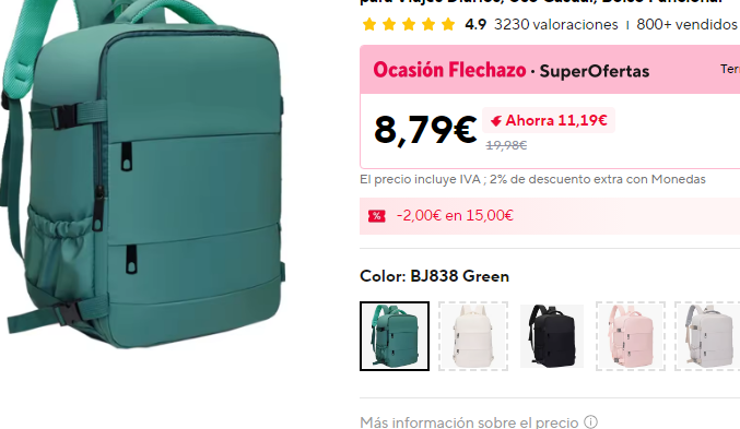 - Producto Mochila de cabina AliExpress 40x30x20