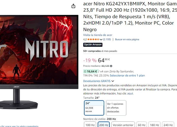 Disponible a 64.9€ en Amazon (captura). Más barato que alternativa AOC 180Hz a 74.3€.