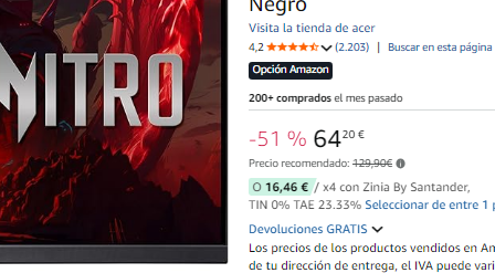 Disponible a 64.2€ en Amazon (captura). Más barato que alternativa AOC 180Hz a 74.3€.