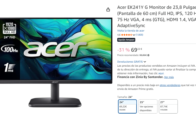 Monitor Acer 24" IPS FULLHD 120Hz ►69.2€