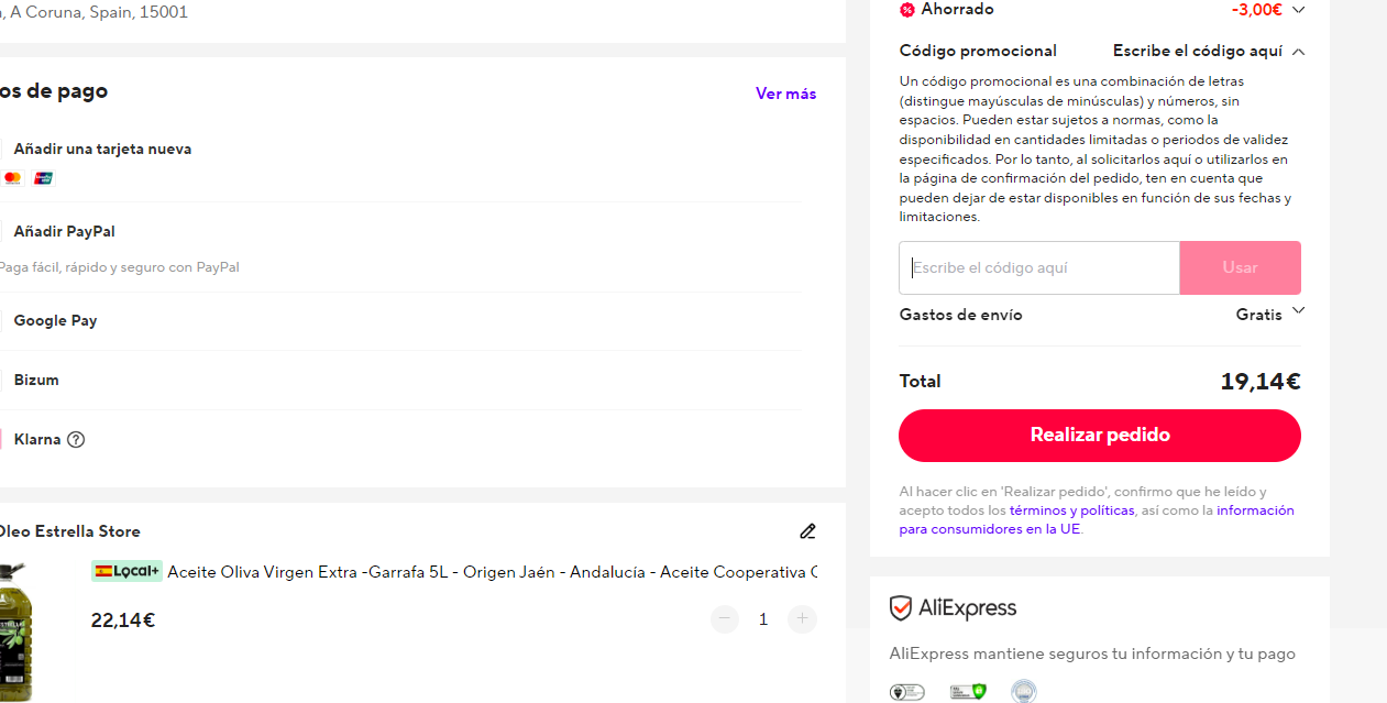 Disponible pack de 3 garrafas de 5L a 20.2€ en Aliexpress aplicando código MES03 (captura). A 3.88€ el litro, más barato que en Más barato que en Amazon a 8€ el litro.