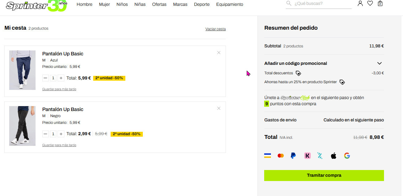 Disponibles 2 a 8.98€ (4.5€/ud.) en Sprinter al comprar 2 (captura). Más barato que similares en Amazon desde 12.9€.