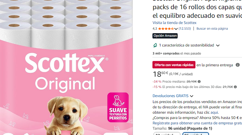 Disponible paquete de 96 rollos a 18.6€ en compra recurrente en Amazon (captura) . A 0.19€ por rollo, más barato que en Aliexpress a 22.2€ .