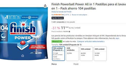 Finish Todo en 1 es un pack disponible en oferta con 104 pastillas para lavavajillas del mismo fabricante que Calgonit (fuente). Son efervescentes incluso en agua fría y vienen en un envoltorio soluble que se deshace solo en contacto con el agua (fuente).