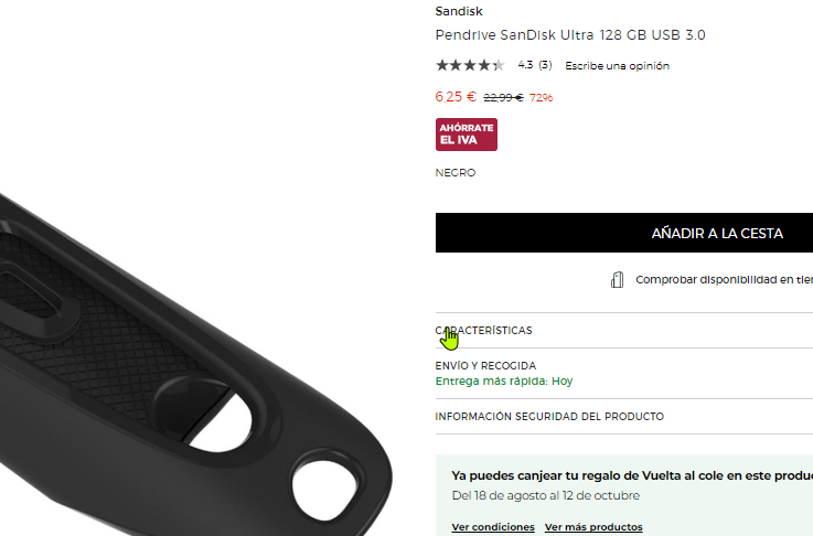 Disponible ver. con 128GB a 6.2€ en El Corte Inglés (captura). Más barato que en otras tiendas, como por ejemplo en Amazon a 9.6€, en Fnac a 13.2€ o en Lambdatek a 28.5€.