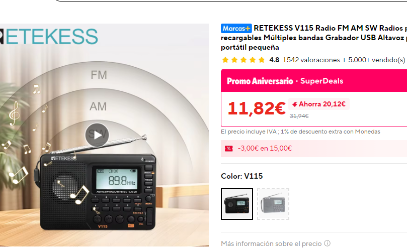 Retekess / TIVDIO V-115 es una radio portátil con batería recargable, sintonizador FM, AM, SW y grabadora incorporada con ranura para tarjeta Micro SD. Puede grabar con calidad 64/96/128kbits emisoras sintonizadas, voz mediante micrófono integrado y audio desde su entrada auxiliar de 3.5mm.