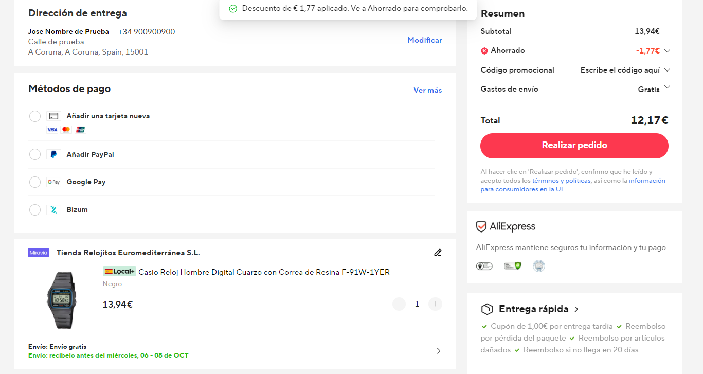 Disponible a 12.2€ en Aliexpress aplicando código IFPYZ53G (captura). Más barato que en Miravia a 17.49€, en Casio a 19.9€ o en Amazon a 17.88€ reac,.