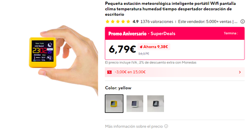 Este reloj destaca por su pantalla a color con resolución 240x240p en la que muestra pronóstico del tiempo, humedad, temperatura, viento etc. además de hora y fecha. Disponible en varios colores, alimentado por puerto USB-C, funciona actualizándose periódicamente usando tu red WiFi.