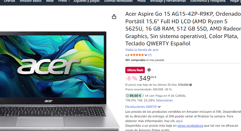 Disponible a 349€ en Amazon (captura) . Más barato que en PC Componentes a 469.4€ con Win11