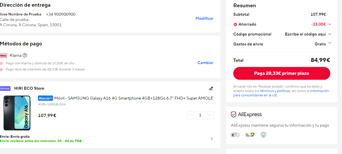 Disponible versión 128GB a 84.99€ en Aliexpress aplicando código ESCD13 + pagando con Klarna (captura). Más barato que en Amazon a 116.9€ con envío.