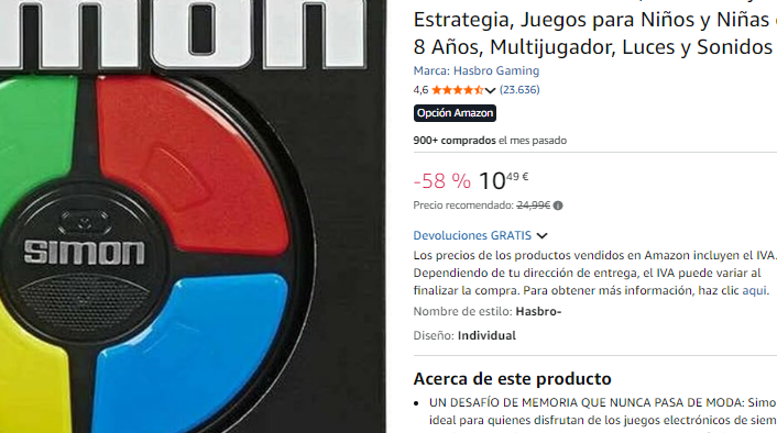 Simon de Hasbro es la versión actualizada del clásico juguete de desarrollo de memoria lanzado en los años 70. Con 4 zonas de diferente color pulsables que reta la memoria del jugador intentando que repita secuencias aleatorias de luces con tonos que van aumentando en complejidad. Todo un reto también para padres, que han de conseguir que el niño prefiera esto en lugar de Youtube Kids.