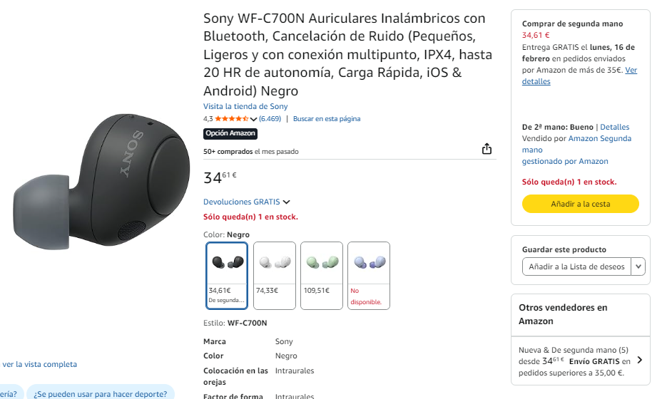 Sony WF-C700N bluetooth con cancelación de ruido activa ►35€ reacon.