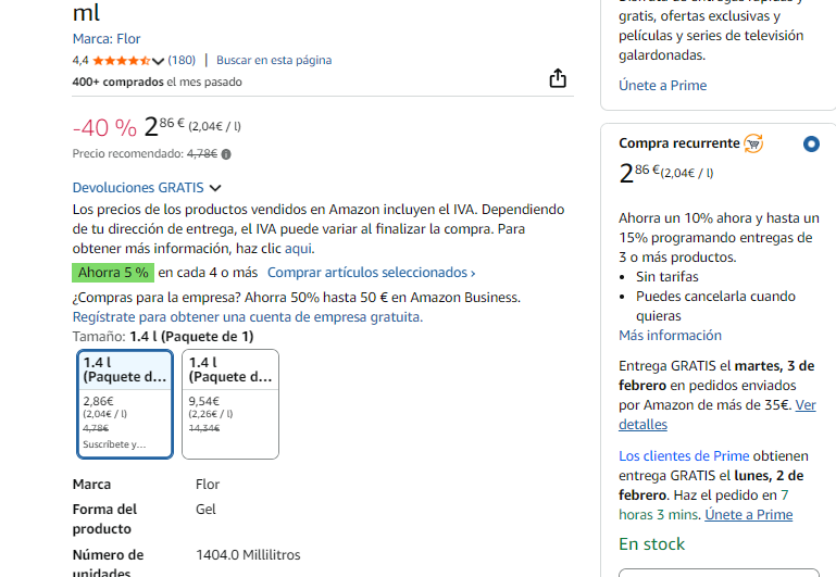 Disponible a 2.86€ en Amazon al pedirlo en compra recurrente (captura) . A unos 0.04€ por lavado, más barato que en Miravia a 0.07€ / lavado.