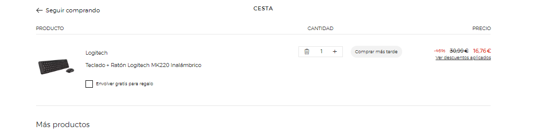 Disponible a 16.76€ al tramitar pedido en El Corte Inglés (captura). Más barato que en otras tiendas, como por ejemplo en Amazon a 24.99€, en Phonehouse a 32.9€ o en Electropolis a 34.4€.