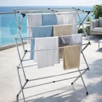 Este Tendedero Plegable Vertical tiene 4 niveles de secado con estructura extensible de 43 a 75 cm de anchura fabricada en aluminio con recubrimiento de epoxi que protege contra el óxido y el moho. Plegado, ocupa solo 51,5 x 43 x 9 cm, lo que permite guardarlo en un armario estrecho o detrás de una puerta sin perder espacio.