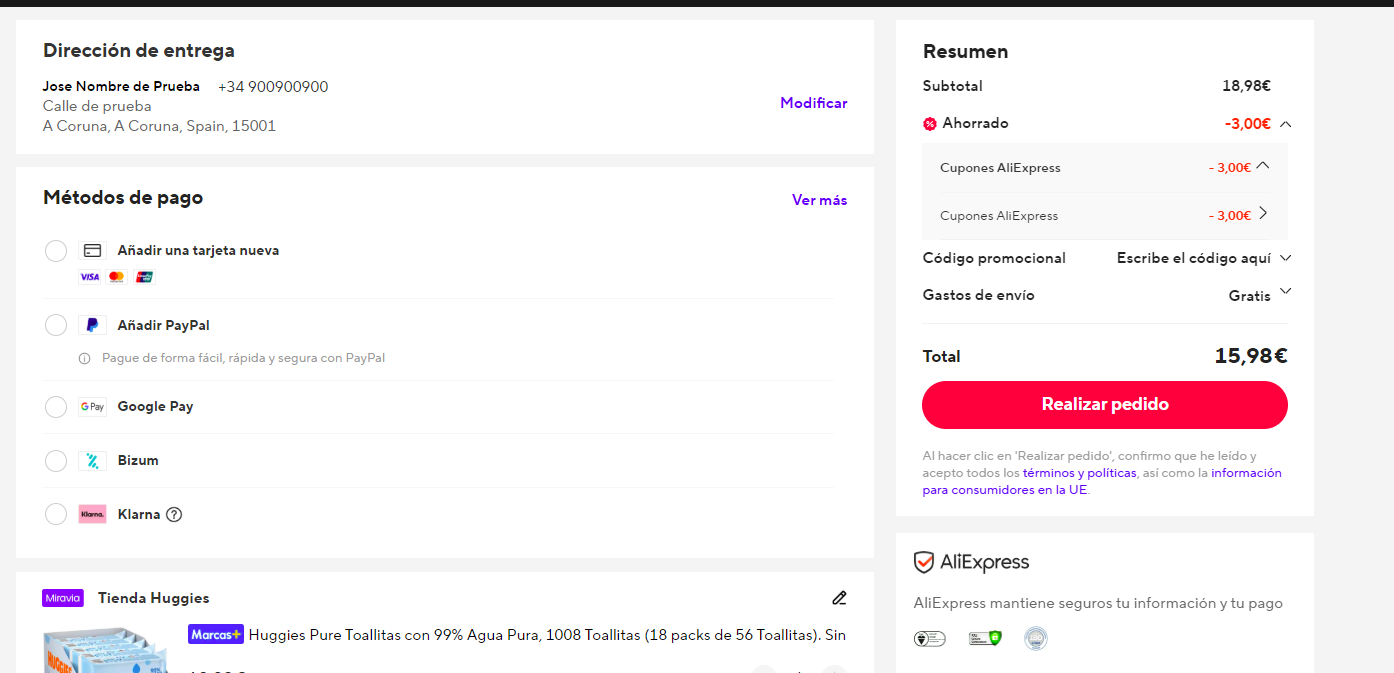 Disponible pack de 1008 toallitas a 15.98€ en Aliexpress aplicando código MES03 (captura). A 0.99€ por paquete, más barato que en Amazon a 17.99€.