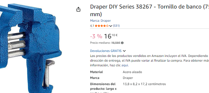 Draper DIY Series 38267 es un tornillo de banco fabricado hierro fundido con pintura resistente a la corrosión y tornillos de acero. Su boca ofrece una apertura de hasta 7.5cm. Pesa 1.691kg y dispone de base atornillable que permite giro + bloqueo rápido.