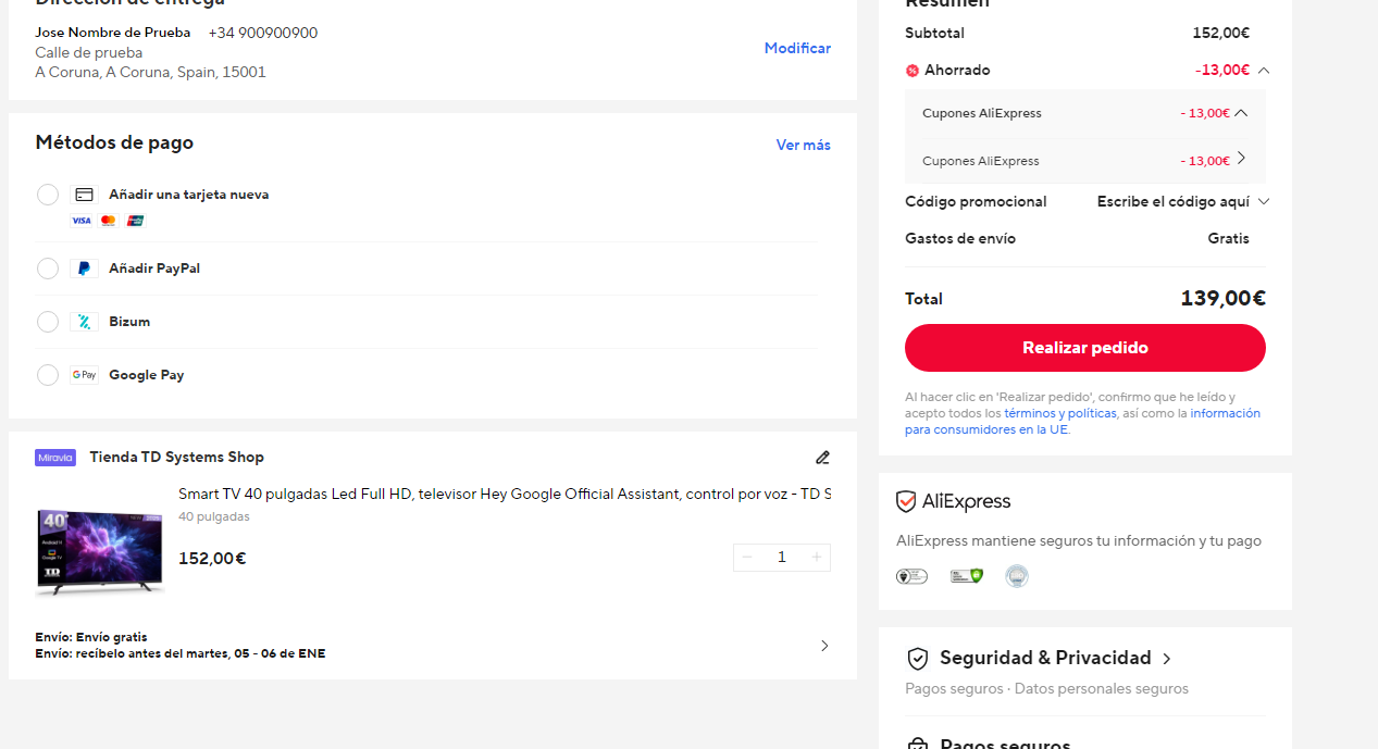 Disponible a 139€ en Aliexpress aplicando código ESCD13 (captura). (captura). Más barato que en Miravia a 178.4€.