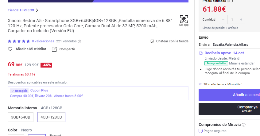 Disponible a 61.9€ en Miravia marcando cupón (¿cómo aplicarlo?)(captura) . Más barato que en Amazon a 84.99€.